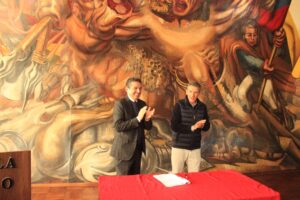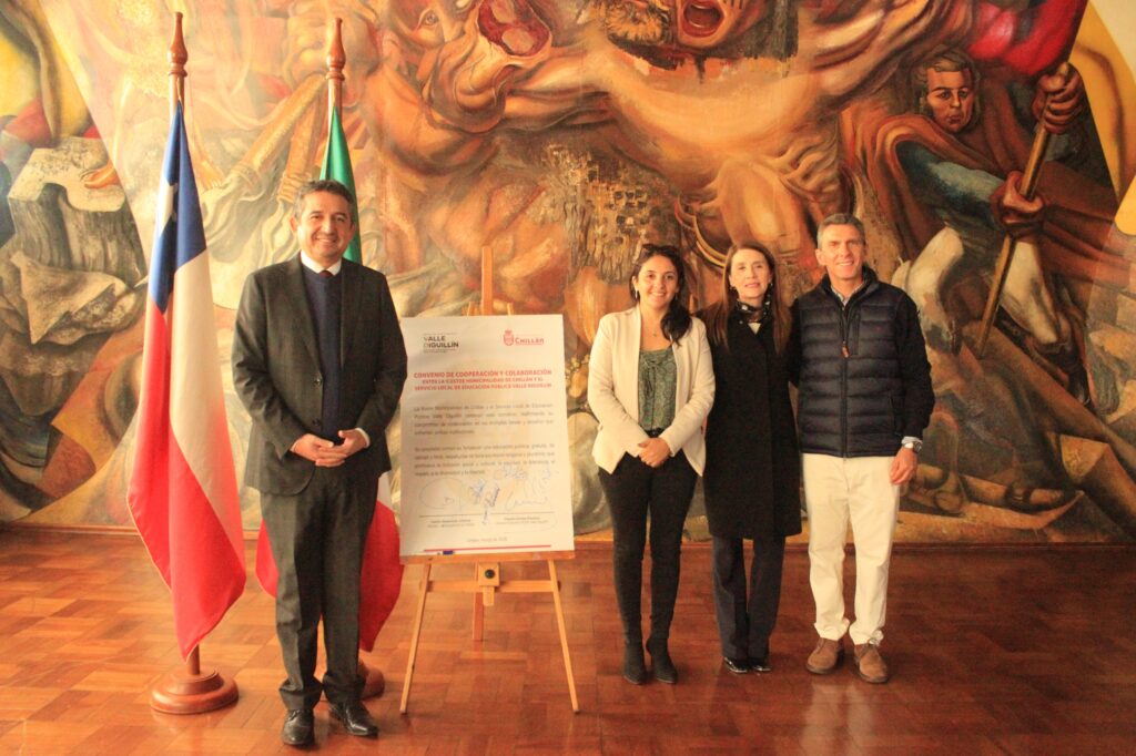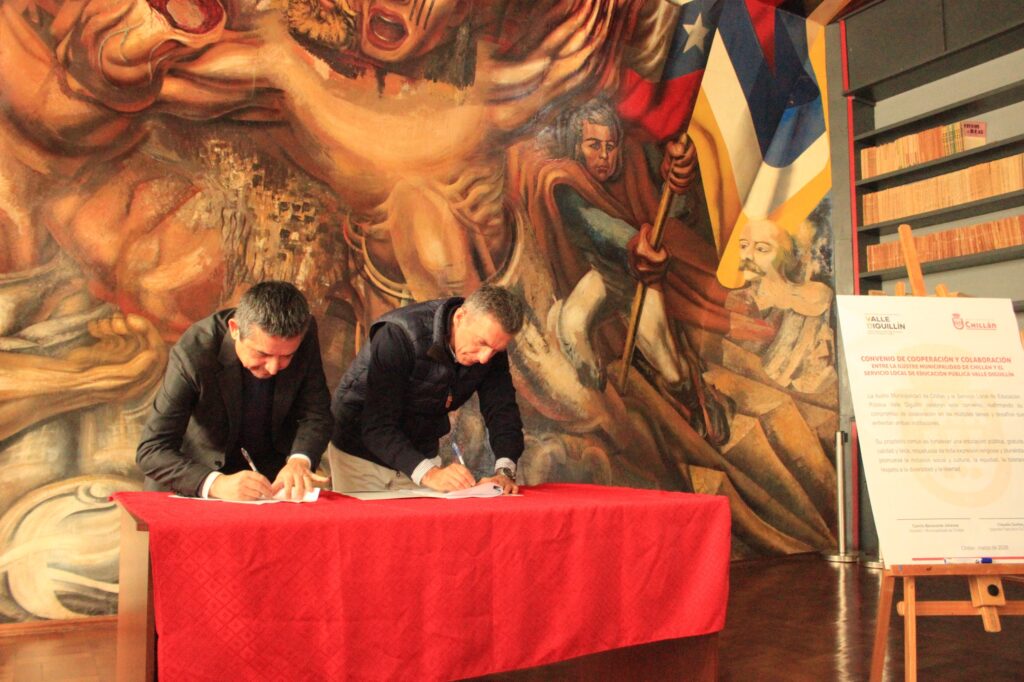El acuerdo fue firmado por el director ejecutivo del Servicio Local de Educación Pública, Claudio Guíñez Pacheco, y el alcalde de la comuna de Chillán, Camilo Benavente, en una ceremonia realizada en la Sala de Los Murales de la Escuela México.
