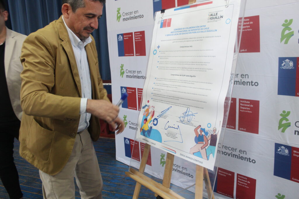 Este acuerdo fue suscrito por el director ejecutivo del SLEP Claudio Guíñez Pacheco y el seremi de Deporte de la Región de Ñuble, Julio Jorquera Jorquera, en una ceremonia realizada en el Liceo Santa Cruz de Larqui en la comuna de Bulnes.